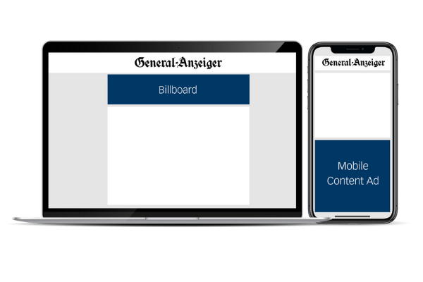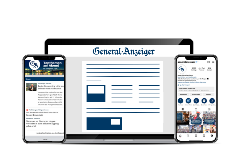 Platzieren Sie Ihr Unternehmen und Ihre Produkte im attraktiven Nachrichtenumfeld von ga.de und sichern Sie sich die Aufmerksamkeit von monatlich bis zu 1,39 Mio. Unique Usern in Bonn und dem Rhein-Sieg-Kreis. Gerne entwickeln wir für Sie Ihre individuelle Kampagne.